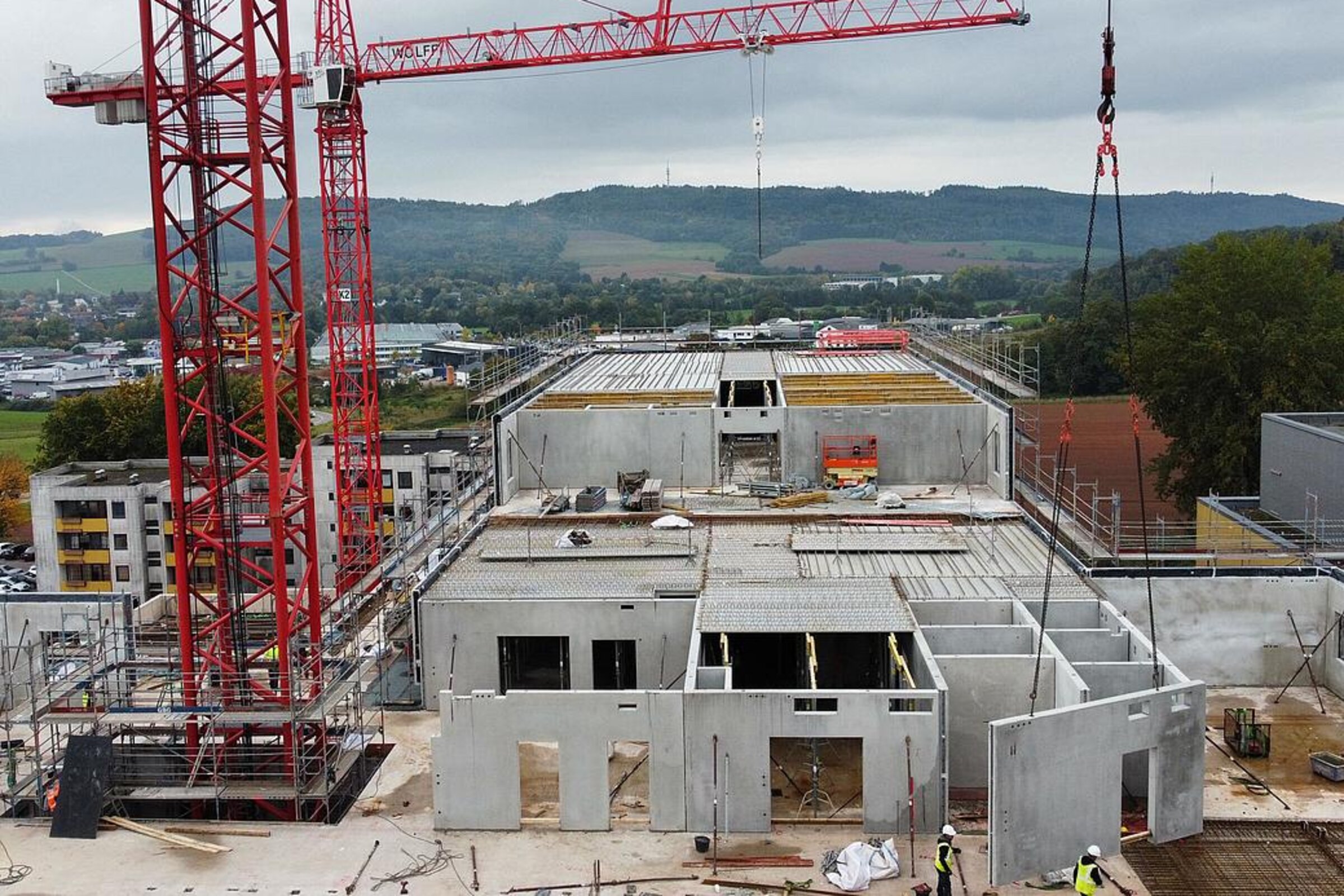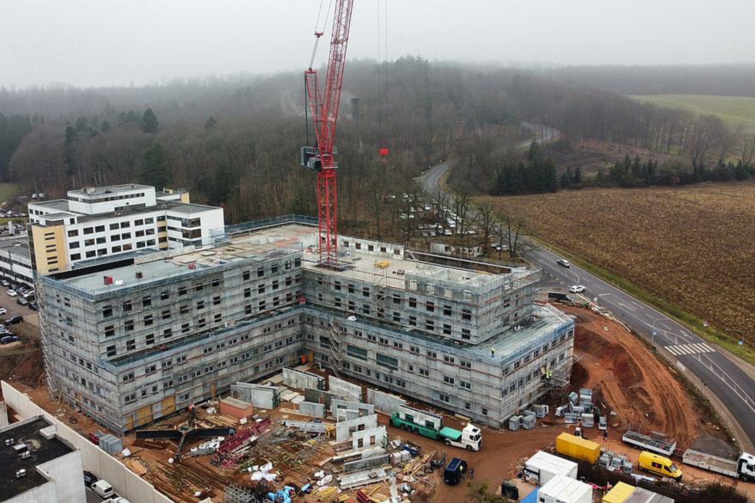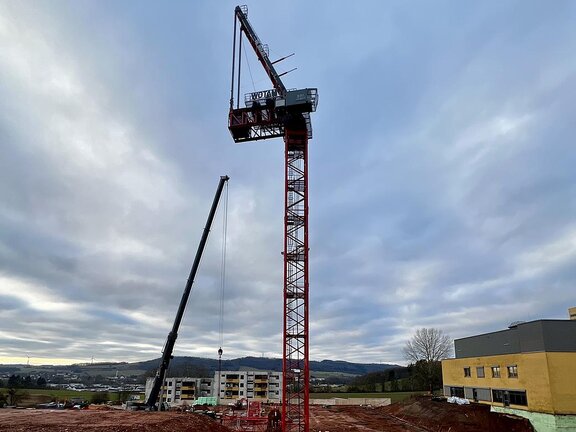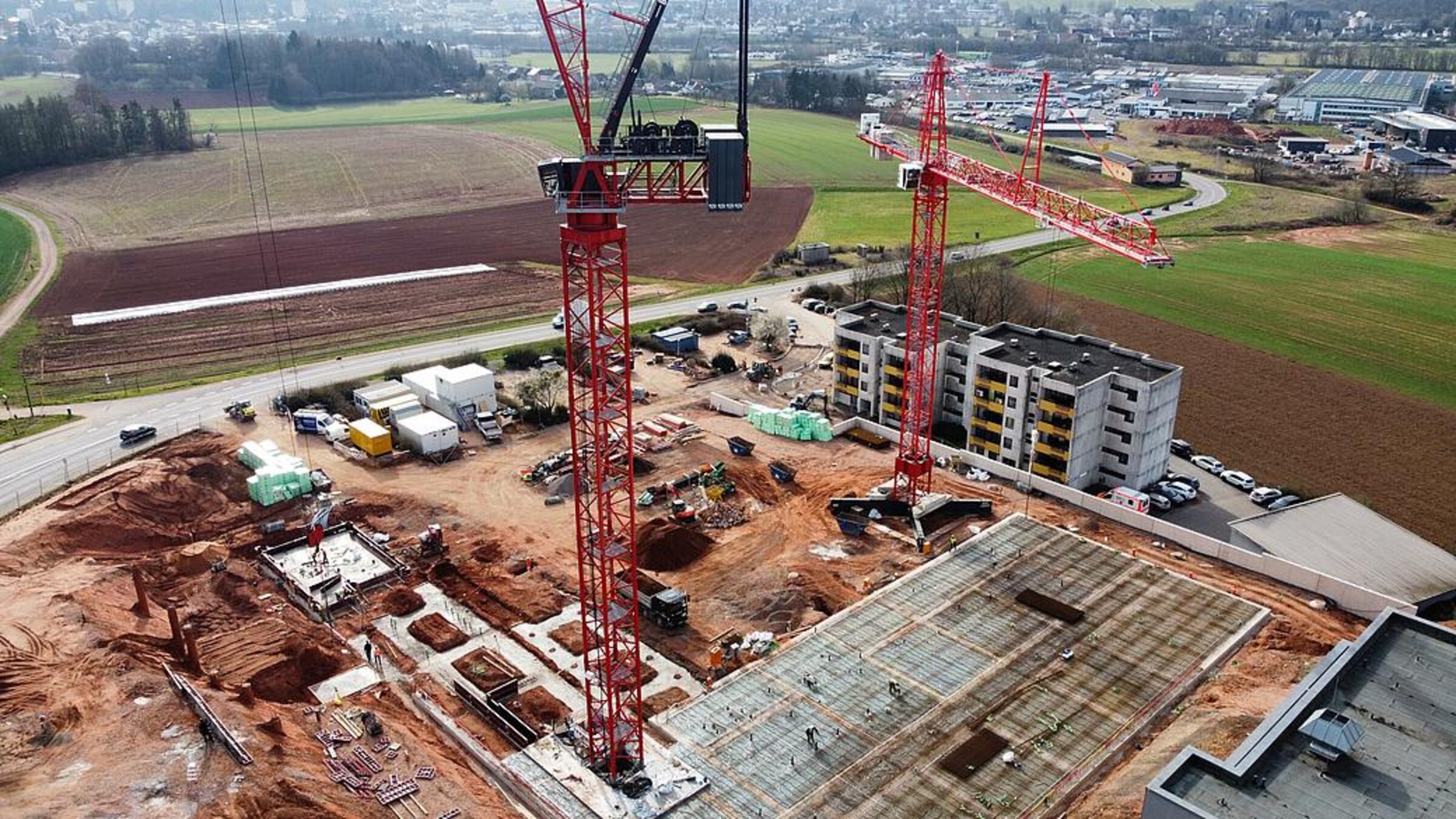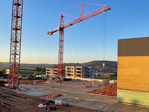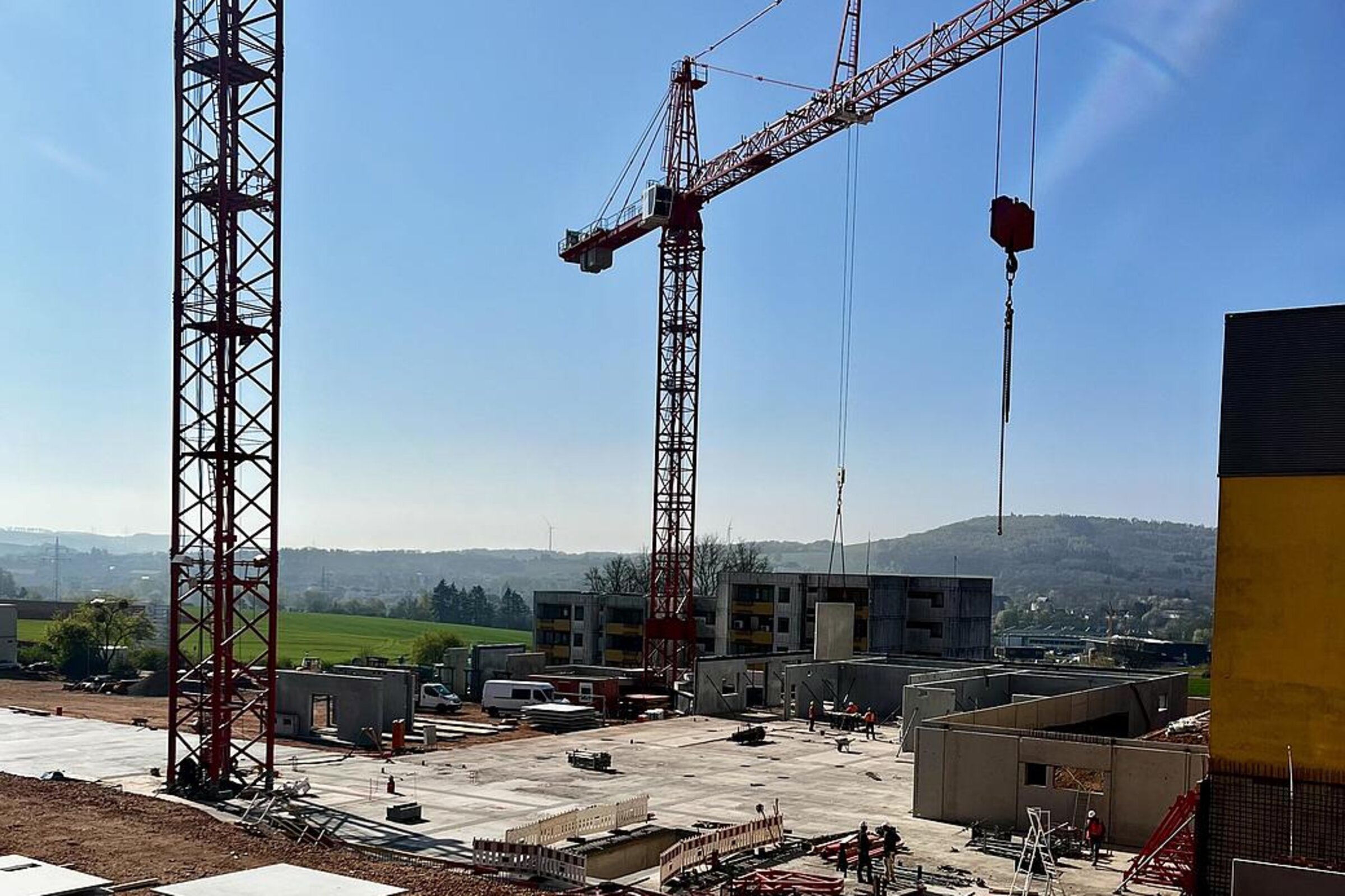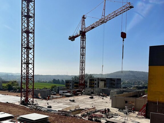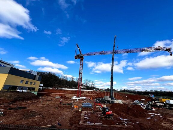 Die Bauarbeiten am Ersatzneubau des Caritas-Krankenhauses Lebach schreiten zügig voran und erreichen eine spannende Phase. Die bauvorbereitenden Maßnahmen auf dem Gelände wurden erfolgreich abgeschlossen und die Tiefbohrfundamente fertiggestellt. Aktuell befindet sich die Bodenplatte in Vorbereitung, sodass sich die Hochbauarbeiten nahtlos anschließen können. Ein besonderes Highlight auf der Baustelle ist der innovative Einsatz eines Großkrans, der direkt im Gebäudeinneren positioniert wird.