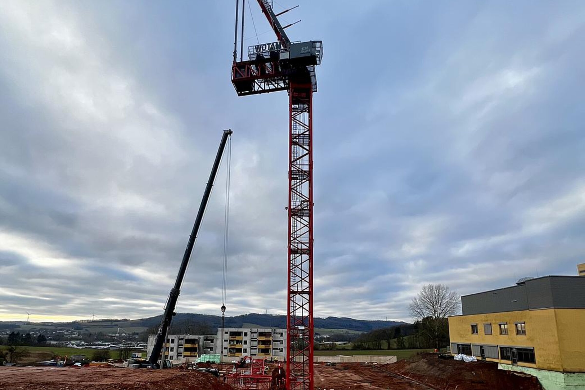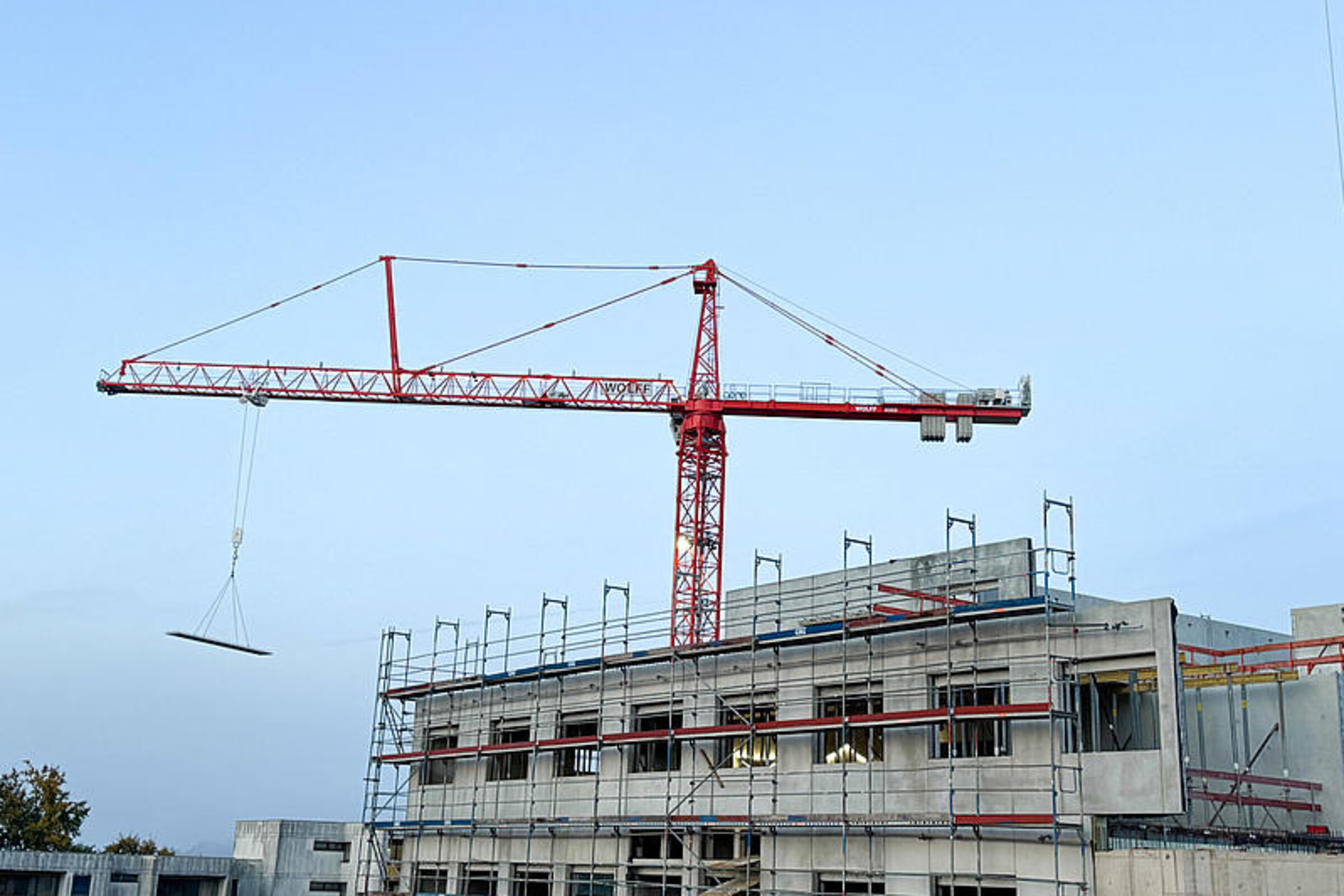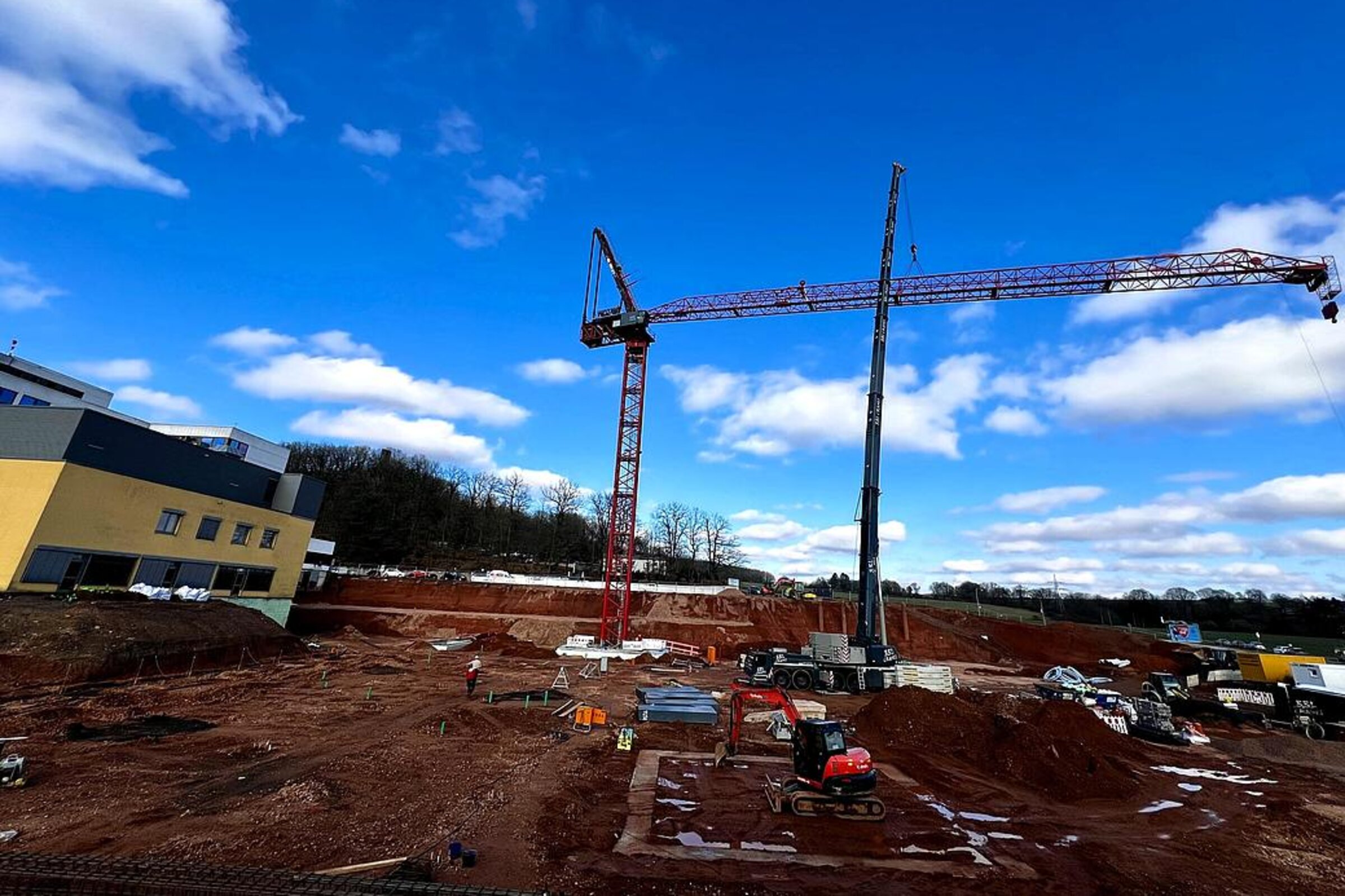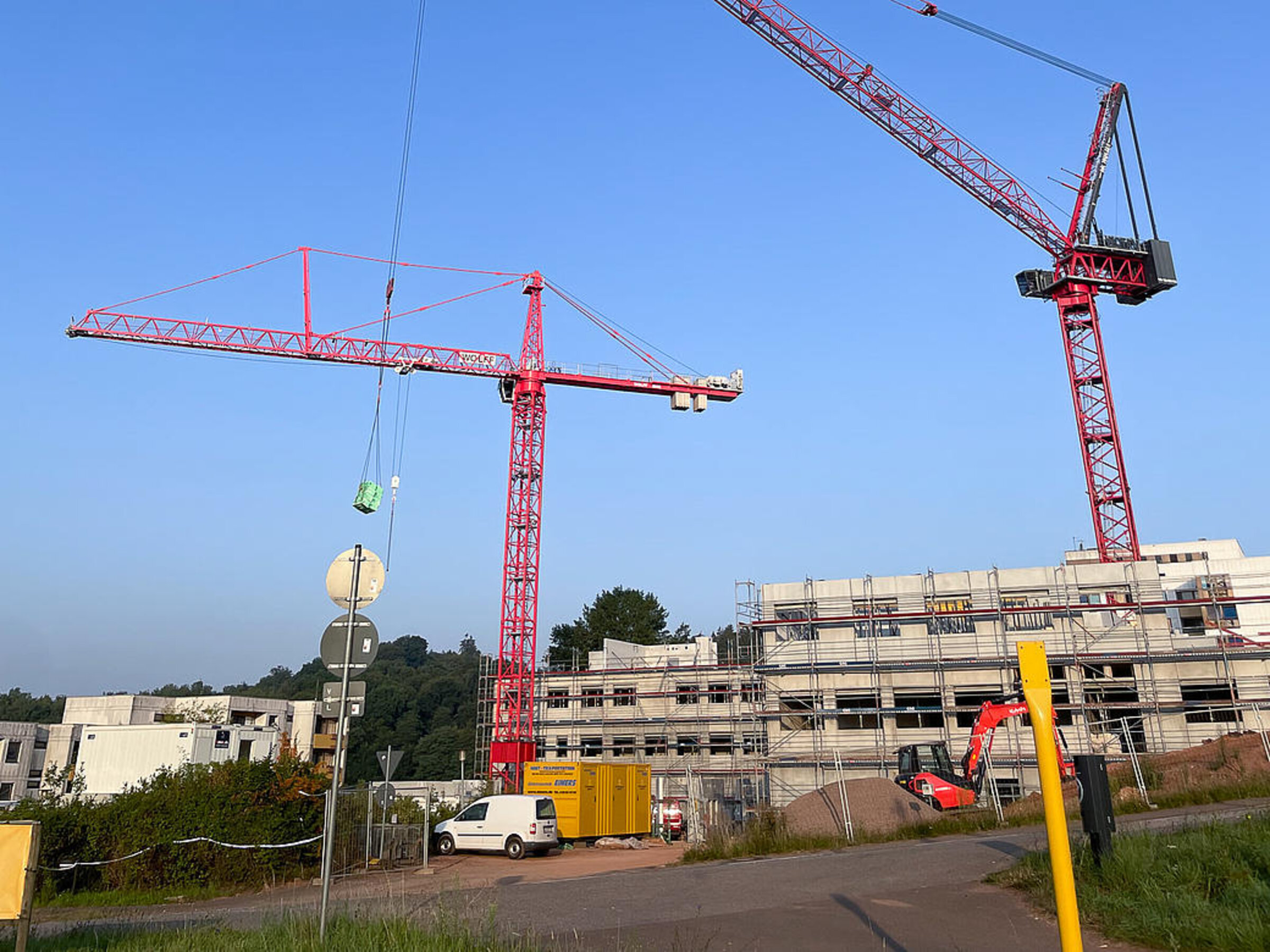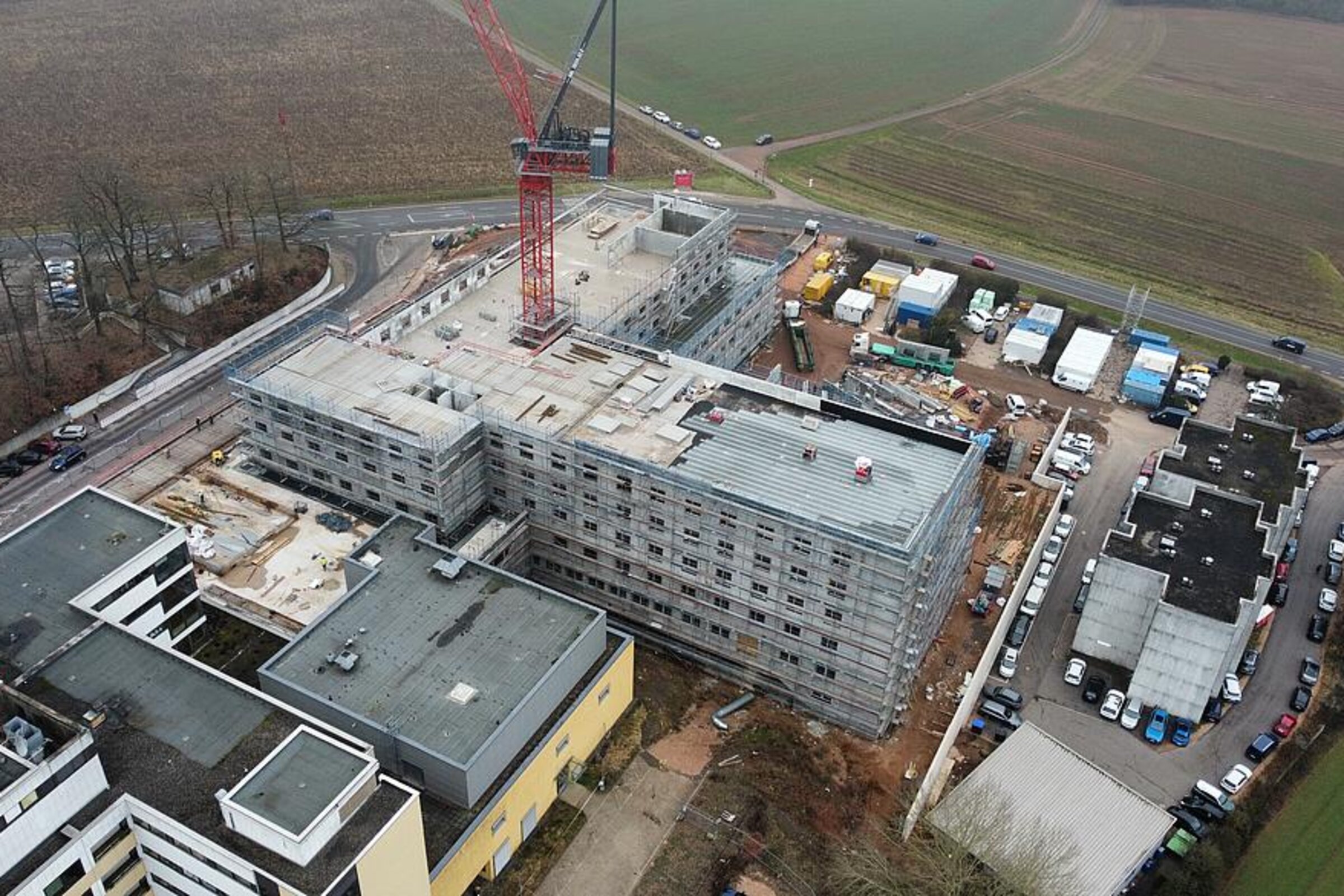 Die Bauarbeiten am Ersatzneubau des Caritas-Krankenhauses Lebach schreiten zügig voran und erreichen eine spannende Phase. Die bauvorbereitenden Maßnahmen auf dem Gelände wurden erfolgreich abgeschlossen und die Tiefbohrfundamente fertiggestellt. Aktuell befindet sich die Bodenplatte in Vorbereitung, sodass sich die Hochbauarbeiten nahtlos anschließen können. Ein besonderes Highlight auf der Baustelle ist der innovative Einsatz eines Großkrans, der direkt im Gebäudeinneren positioniert wird.