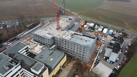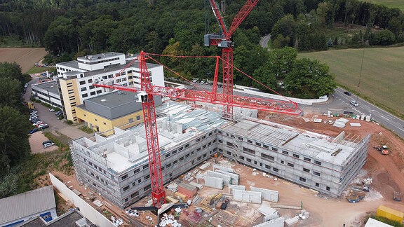 Knapp ein Jahr nach dem Spatenstich nimmt der Ersatzneubau des Caritas-Krankenhauses Lebach immer deutlicher Gestalt an. Der Rohbau schreitet in großen Schritten voran. Die Arbeiten an den beiden Untergeschossen sind bereits abgeschlossen, im Erdgeschoss geht es zügig voran und auch das erste Obergeschoss wächst bereits in die Höhe – hier werden bereits die künftigen Patientenzimmer erkennbar.