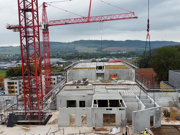 Der Bau des dritten und letzten Obergeschosses ist in vollem Gange. Die Rohbauarbeiten verlaufen planmäßig, und die Fenster werden bereits eingesetzt, sodass die äußere Gestalt des Ersatzneubaus zunehmend erkennbar wird. Zeitnah werden die technischen Gewerke mit ihren Arbeiten in den Bereichen Heizung, Sanitär, Elektro und Lüftung beginnen. Auch die Trockenbauer bereiten sich auf ihren Einsatz vor. Die Fortschritte sind deutlich sichtbar: Das Gebäude wächst stetig in die Höhe und nimmt Schritt für Schritt sein zukünftiges Erscheinungsbild an.