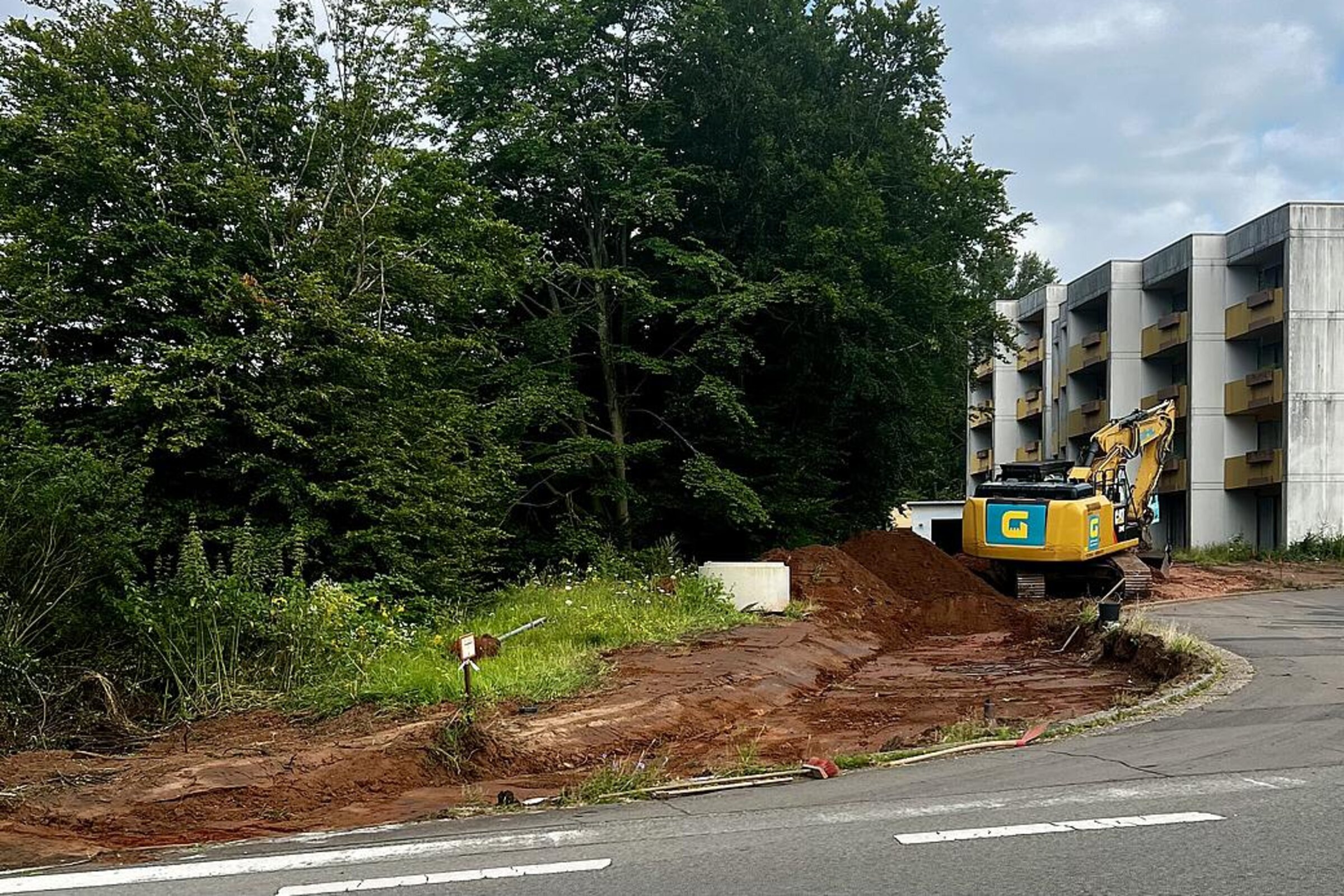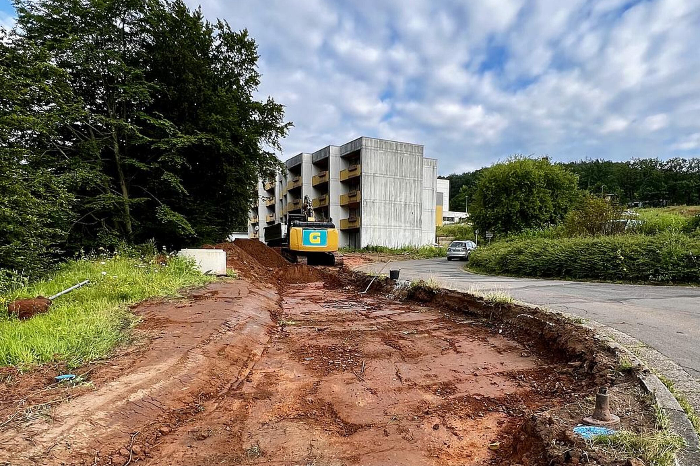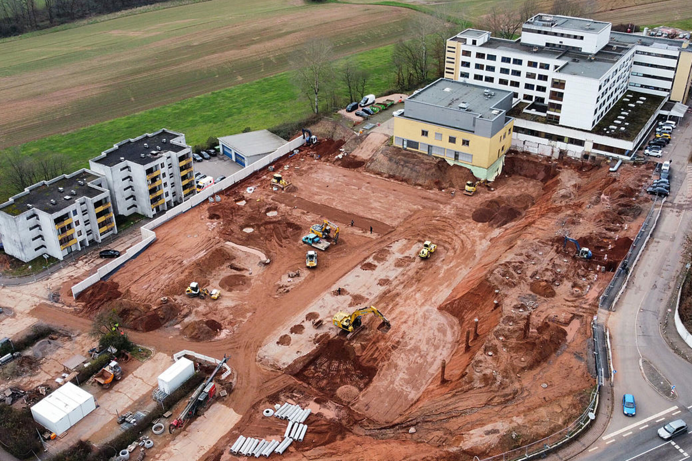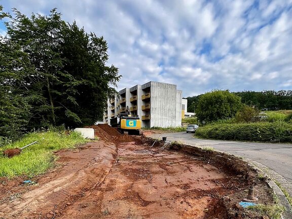 Der lang ersehnte Baubeginn für den Ersatzneubau des Caritas-Krankenhauses Lebach ist am 22. Juli offiziell erfolgt. In der 30. Kalenderwoche wurde bereits das erste zentrale Element der Anfangsphase erfolgreich umgesetzt. Die bereits fertiggestellte Umfahrung für die Einsatzfahrzeuge der DRK-Rettungswache stellt sicher, dass der Betrieb auch während der gesamten Bauzeit reibungslos weiterläuft. Als nächster Schritt steht der Abriss der Garagen vor den Wohnheimen an. Dieser wird bereits in der kommenden Woche durchgeführt, um Platz für die weiteren Bauarbeiten und die Baustelleneinrichtung zu schaffen. Im August erfolgt die Errichtung einer Stützmauer vor den Wohnheimen. Die Stützmauer ist erforderlich, um das Erdreich am Geländeversprung zu sichern und ein Abrutschen zu verhindern.