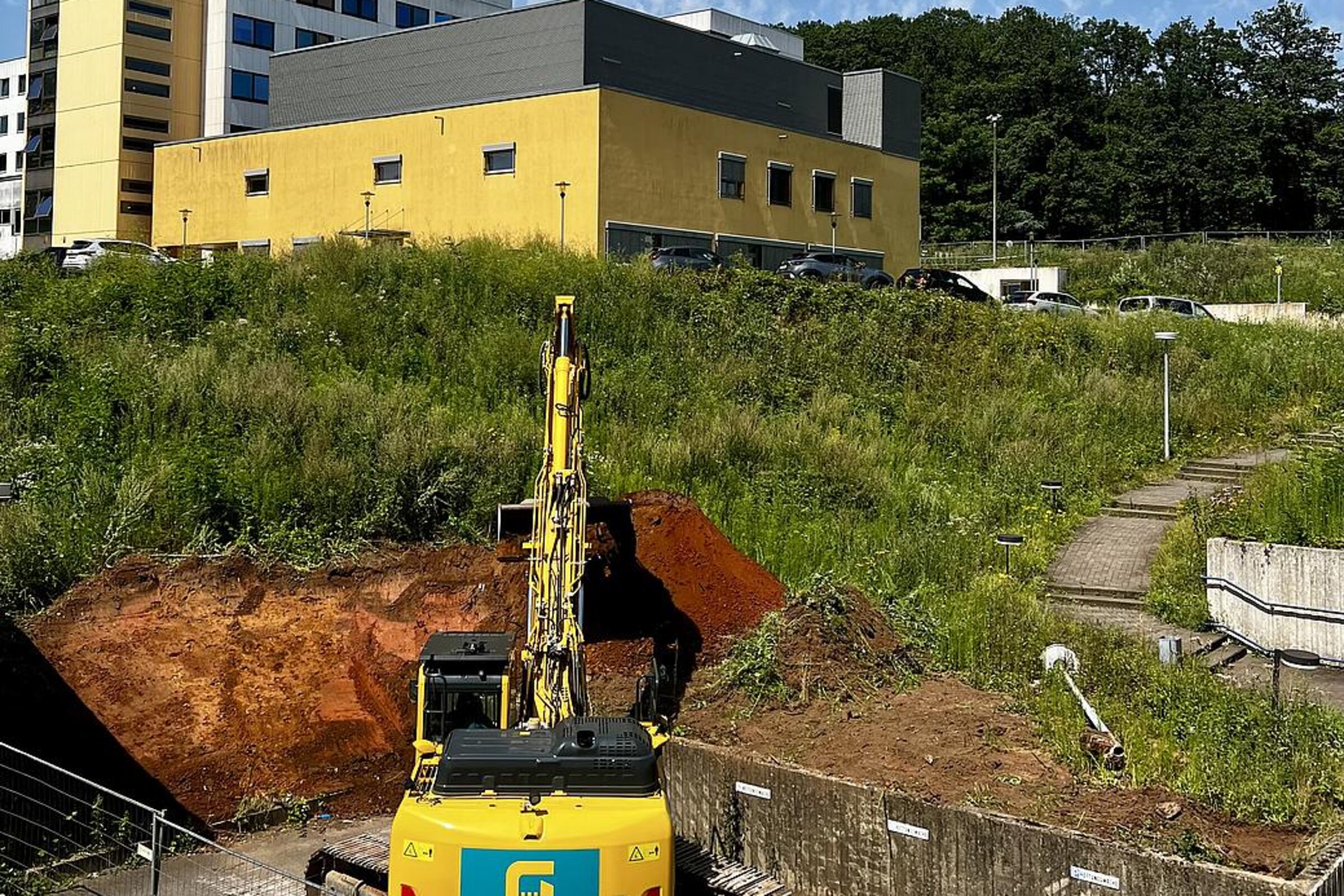 Entlang der rechten Seite wurde die angekündigte Stützmauer vor den Wohnheimen errichtet. Diese ist erforderlich, um das Erdreich am Geländeversprung zu sichern und ein Abrutschen zu verhindern, sodass die Stabilität des Baugrunds gewährleistet bleibt.