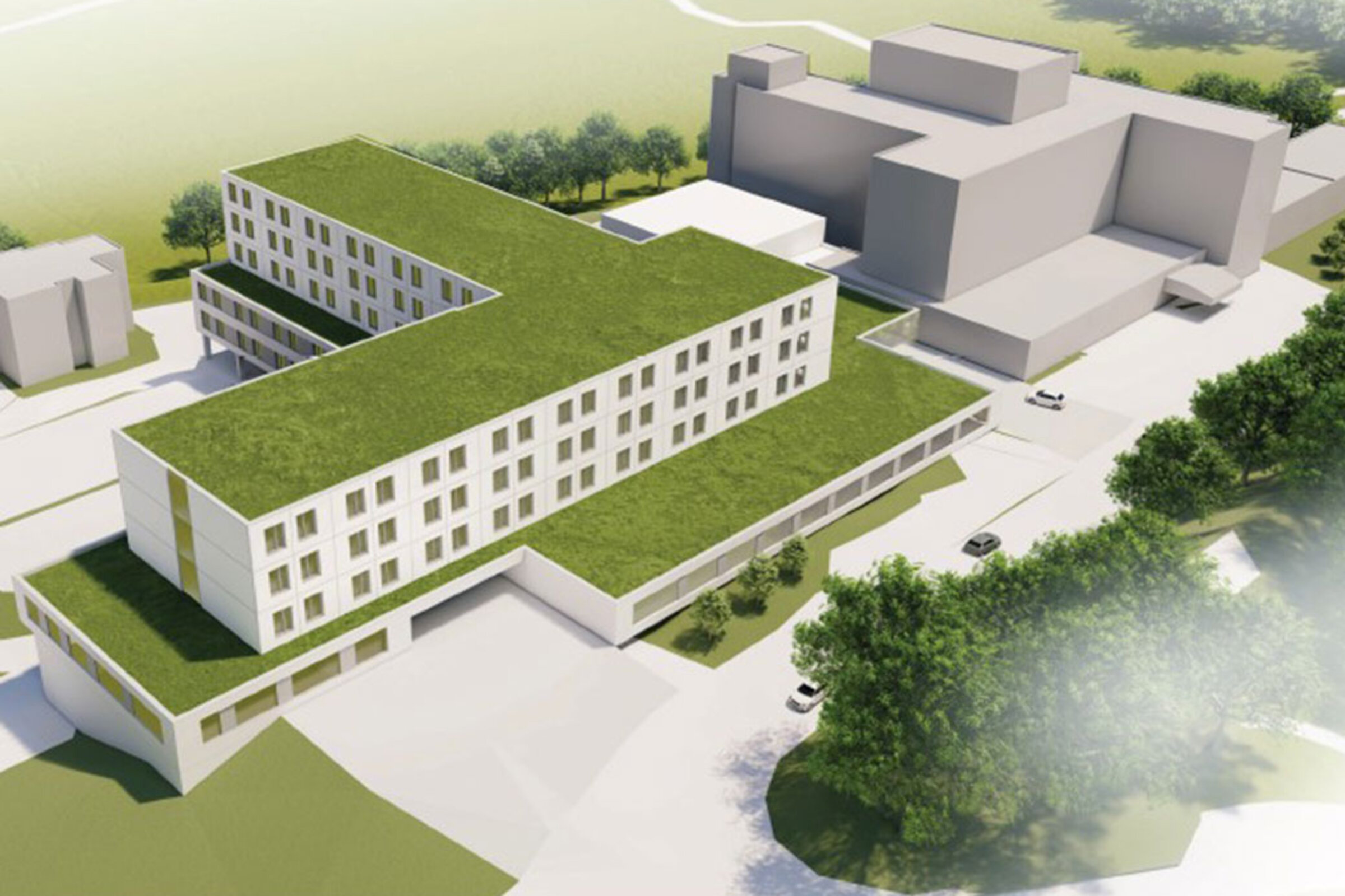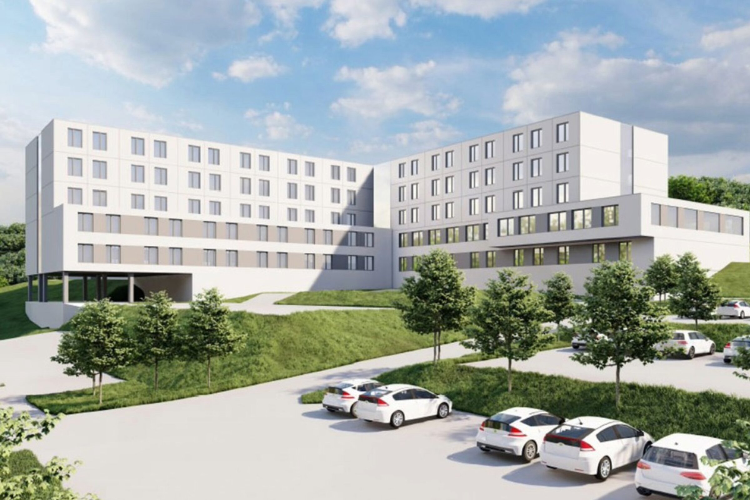 Die Planung sieht vor, östlich des vorhandenen Krankenhauses in Lebach einen Neubau auf den dort vorhandenen Grün- und Parkierungsflächen zu errichten. Er wird als Flachdachbaukörper mit zwei gestaffelten Untergeschossen, einem Erdgeschoss, drei Obergeschossen sowie einer Technikzentrale auf dem EG und dem 3. OG vorgesehen. Die Gestalt des L–förmigen Baukörpers folgt der Logik der Funktionen und der Einbettung in die Topographie. Zielsetzung war der Erhalt der grundsätzlichen Erschließungsstruktur auf dem Grundstück. Mit der gewählten Lage des Gebäudes kann dies umgesetzt werden. Die bestehenden Zufahrten und die Umfahrt bleiben erhalten und können auch für den Neubau weiterhin genutzt werden. Schritt für Schritt in Richtung Zukunft.